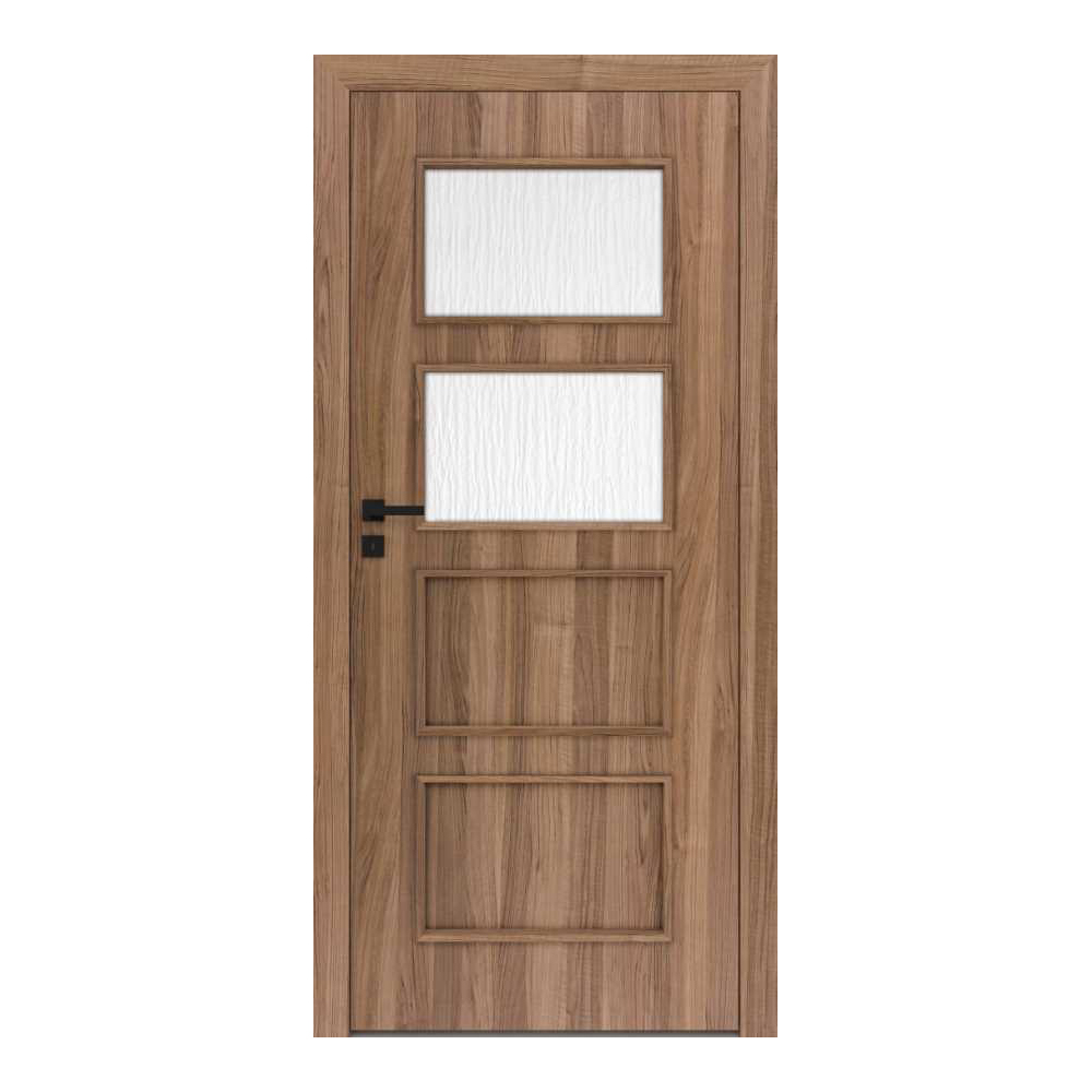 Aukštos kokybės vidaus durys suteiks jūsų erdvei modernios elegancijos. Eco laminatu dengtos durų varčios yra aklinos arba su stiklu. Varčios paviršiai yra padengti ekologišku UV laku, kuris turi daug didesnį atsparumą įbrėžimams ir šviesai nei standartiniai lakai, klojami net keliais sluoksniais. Varčia tvirtos konstrukcija iš medinio rėmo. Grūdintas stiklas, baltas matinis, bronzos, graffito spalvos arba skaidrus, storis 4 mm