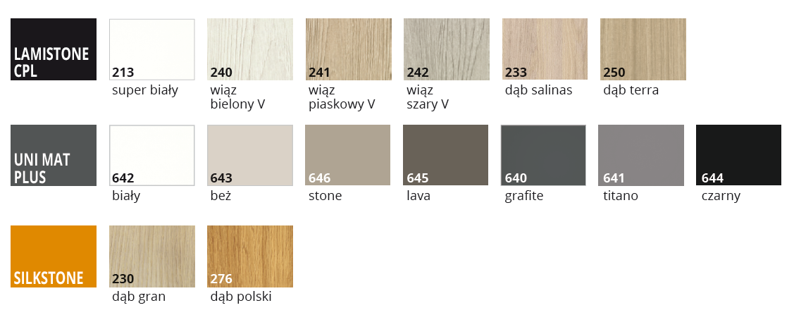 • Sidabriniai 2 dalių horizontaliai reguliuojami vyriai užlaidinėje varčioje, lygiabriaunėje varčioje paslėpti vyriai (už papildomą kainą )